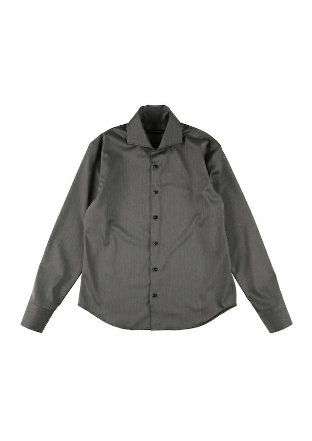 1piu1uguale3の定番として展開している襟先の広がったホリゾンタルカラーを採用したプレーンシャツ。首元の見え方を重視し、襟開きが180度に近くややオープンカラー気味に綺麗に開く様に形成しています。附属する釦はドレスシャツによくある貝釦ではなく1piu1uguale3ロゴ入りの本水牛シャツ釦を採用しています。